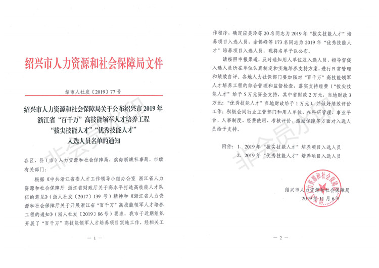 近日,申发轴瓦的人才培养项目工程又有了新成绩。许永利入选浙江省“百千万”高技能领军人才培养工程“拔尖技能人才”,车工技师许波入选浙江省“百千万”高技能领军人才培养工程“优秀技能人才”,车工技师“赵钦光”荣获绍兴市“突出贡献高技能人才”称号。