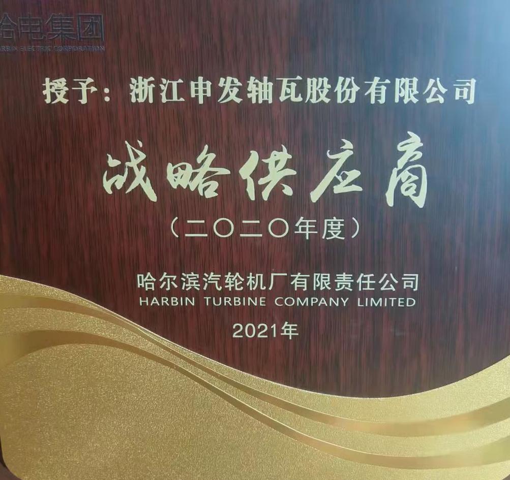 好雨惊连夜,疏种喜报晨。近日,浙江申发轴瓦股份有限公司以优质的滑动轴承产品和精心的售后服务从哈尔滨汽轮机厂有限责任公司众多供应商中脱颖而出,荣获2020年度“战略供应商”奖牌。