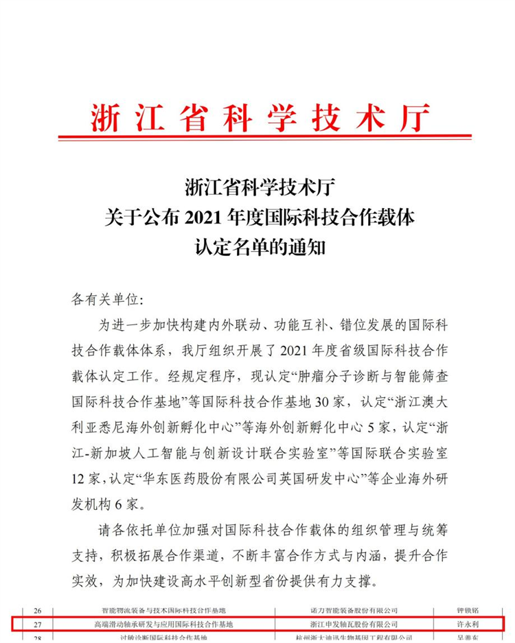 近日,浙江省科学技术厅发文公布了2021年度国际科技合作载体认定名单,申发轴瓦申报的“高端滑动轴承研发与应用国际科技合作基地”被认定为省级国际科技合作基地。