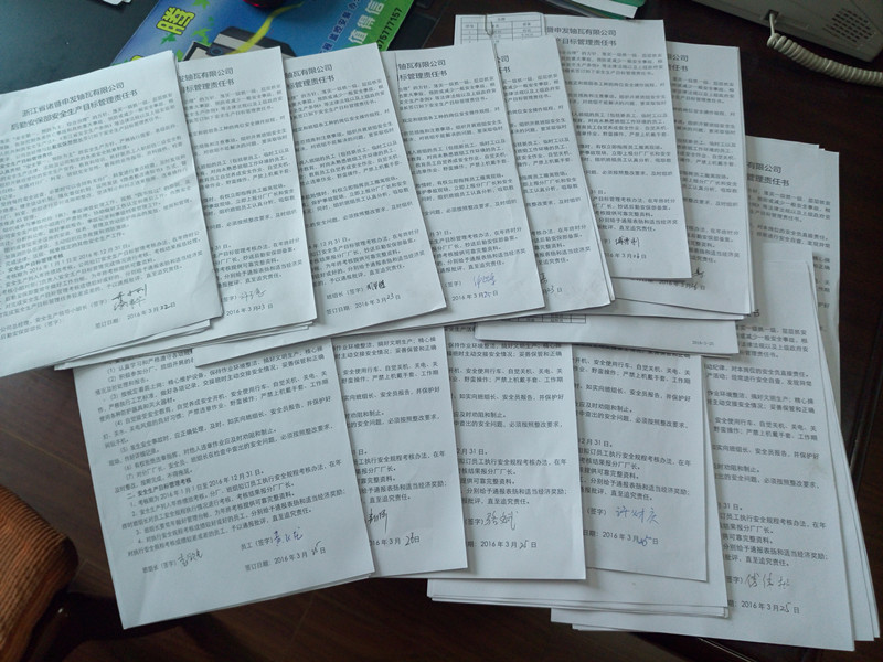 为坚持“安全第一,预防为主,综合治理”的方针,落实一级抓一级、层层抓安全的管理措施,有效控制各类伤亡事故和其他重大事故,预防或减少一般安全事故,根据《中华人民共和国安全生产法》、《浙江省安全生产条例》等法律法规以及上级安监部门关于安全生产工作的精神,申发轴瓦有限公司组织企业和部门、部门与班组、班组与员工层层签订安全生产目标管理责任书。