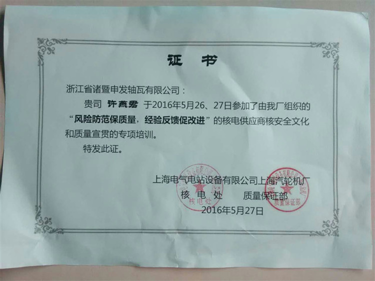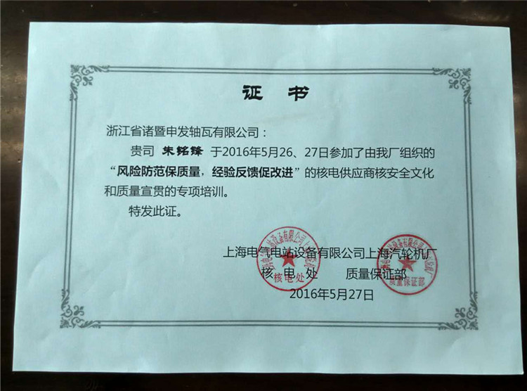 培训会上,上汽厂还给申发轴瓦公司的与会人员颁发了核电供应商核安全文化和质量宣贯专项培训证书。