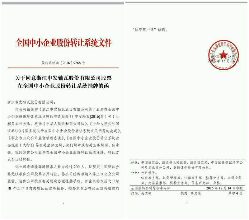 恭喜浙江申发轴瓦股份有限公司挂牌上市新三板。证券简称:申发轴瓦 证券代码:870375。