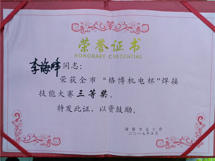 5月28日上午,申发公司高级电焊工李海峰师傅参加了由诸暨市总工会组织的“格博机电杯”全市焊接技能大赛。