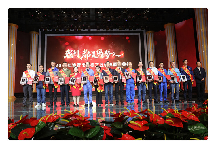 4月29日,2019年诸暨市劳模、工匠表彰颁奖典礼举行,许波(左三)上台领奖。